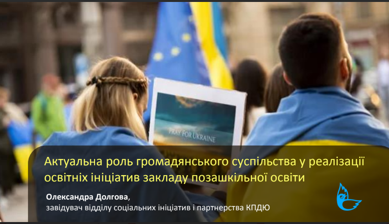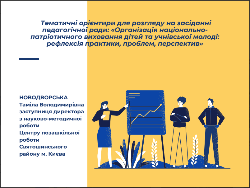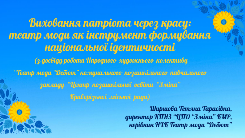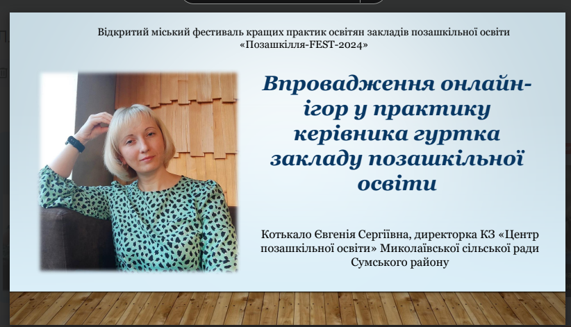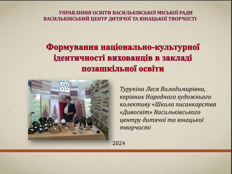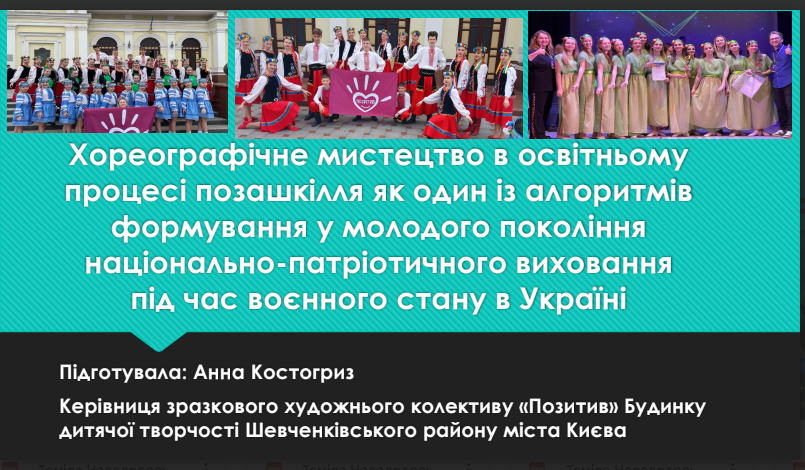 ПОЗАШКІЛЛЯ – FEST – 2024 Фотогалерея Фестивалю 2024 Матеріали Фестивалю 2024 Ірина ЧУРСА. Центр творчості на Чарівній – центр розвитку освітніх ініціатив та підтримки у прифронтовому місті Тетяна ШИРШОВА. Виховання патріота через красу: театр моди як інструмент формування національної ідентичності Олександра ДОЛГОВА. Актуальна роль громадянського суспільства у реалізації освітніх ініціатив закладу позашкільної освіти Тетяна МЕЛЬНИК. Реалізація проєктної діяльності в закладі позашкільної освіти Євгенія КОТЬКАЛО. Впровадження онлайн-ігор у практику роботи керівника гуртка закладу позашкільної освіти Анна КОСТОГРИЗ. Хореографічне мистецтво в освітньому процесі позашкілля як один із алгоритмів формування у молодого покоління національно- патріотичного виховання під час воєнного стану в Україні Олена КОВАЛЬКО. Театр-студія «Барвінок» – місце, де створюють новий Світ Ганна КОНАЗЮК. Задум та реалізація творчих проєктів як складник мистецької освіти крізь призму національно- патріотичного та культурно- естетичного аспектів Лариса СТОРОЖКО. Актуальні питання виховання громадянина-патріота в умовах сьогодення: методичний кейс Ганна КОВГАНИЧ. Тренінгова програма «Концептуальні засади національно- патріотичного виховання дітей та молоді у закладі позашкільної освіти» Людмила ТОКАРЕНКО. Інтеграція інтерактичної діяльності в освітній процес Олена МАЙДАНЕЦЬ-БАРГИЛЕВИЧ. Художні та технологічні особливості розпису писанок Зоя МІФТАХОВА. Арт-терапія: види, методи та їх сутність Юлія МІЩАН. Національно-патріотичне виховання учнів засобами українського етнодизайну Олеся БАЗИЛЕВСЬКА. Психолого-педагогічна адаптація вихованців дошкільного віку в закладах позашкільної освіти в умовах сьогодення Юлія МЕЛЬНИЧЕНКО. Образотворче мистецтво, театр та анімація: світ необмежених можливостей Наталія ВОЙЧУК. Використання національно- культурного потенціалу як один із шляхів формування підростаючого покоління Світлана РЯБІНКО. Творче життя та особливості репертуару дитячого хорового колективу в сучасних реаліях Таміла НОВОДВОРСЬКА. Тематичні орієнтири для розгляду на засіданні педагогічної ради «Організація національно- патріотичного виховання дітей та учнівської молоді: рефлексія практики, проблем, перспектив» Лариса ГОЛУБ. Розвиток культурно-естетичного творчого потенціалу дітей та молоді – основа національно-патріотичного виховання Юрій ІВАНОВ. «Одухотворення мрій» - досвід роботи дитячої анімаційної студії «КРОК» Надія ЛУК'ЯНЮК, Марина ДОВГАЛЬ. Роль БДЮТ «Дивоцвіт» у формуванні творчого потенціалу та національної свідомості дітей та молоді Олена АНТОНОВА. Організація змістовного дозвілля дітей та молоді під час канікул Ірина ЦАТУРЯН. Роль соціальної реклами у вихованні патріотизму в умовах воєнного стану Тетяна ПРОТОЧЕНКО. Національно-патріотичне виховання дітей та учнівської молоді: потенціал соціального проєкту Ганна КОВАЛЬЧУК, Діана НЕДЛІНСЬКА. Організація ігрової діяльності в роботі керівника гуртка Юлія АПАНАСЕНКО. Духовне та культурно-естетичне виховання дітей та учнівської молоді в гуртку «Мистецтвознавці» Наталія ДАВИДЕНКО. Калейдоскоп народних свят Наталія ДАВИДЕНКО. Краєзнавчо-пізнавальний квест «Перегони шалені в метрополітені» Світлана ЛАГУТІНА. Концептуальні засади проєкту «Розповім 